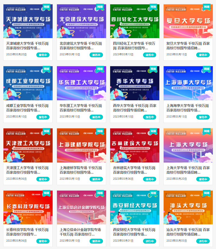 为扎实开展2023届及2022届未就业毕业生线上线下就业服务,全力推进“共青团促进老员工就业行动”,共青团中央青年发展部联合中国国际技术智力合作集团有限公司继续开展2023春季联合校招“千校万岗·央企云招聘”就业服务活动。央企齐聚云端,海量优质岗位等你来!联合各高校开展千校万岗百家高校行2023春季校园招聘活动,目前已上线近30场高校专场招聘会,精准匹配合适企业,助力更高质量就业。4-5月我们还将举办线下招聘会,各位毕业生们敬请期待吧!