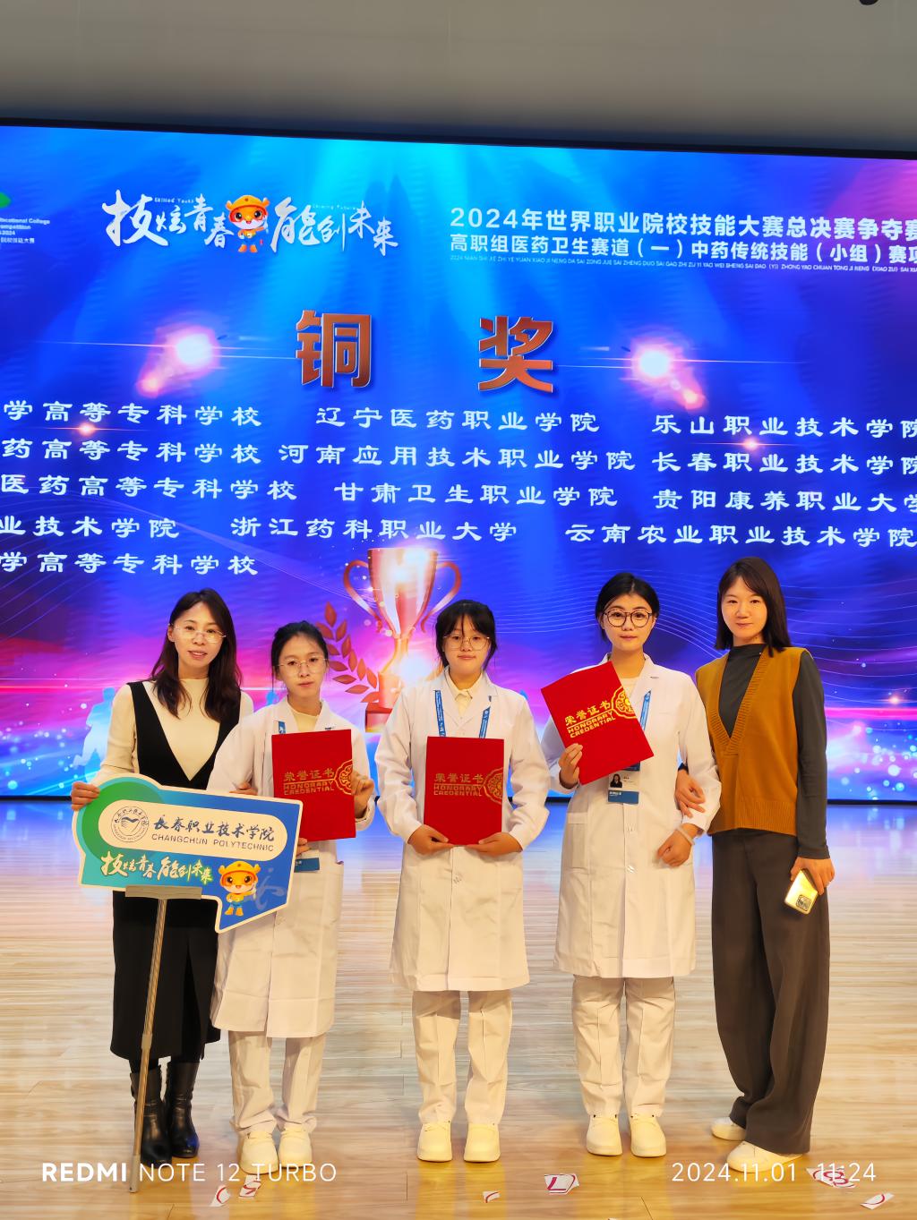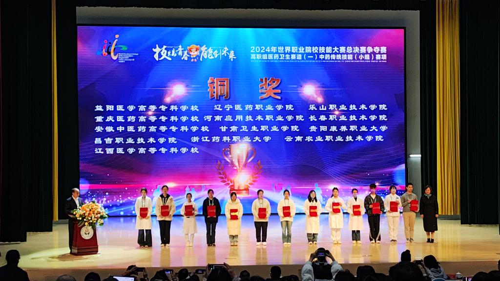 10月28至31日,2024年世界职业院校技能大赛中药传统技能(赛项)总决赛争夺赛在青海省卫生职业技术公司举行,来自全国30个省、自治区、直辖市的55支队伍参加了比赛。经过激烈的角逐,公司教师孙晓玲、王莹指导的员工董佳雪、郭思涵、宋浩然以603分的成绩荣获小组第三名,勇夺铜奖。