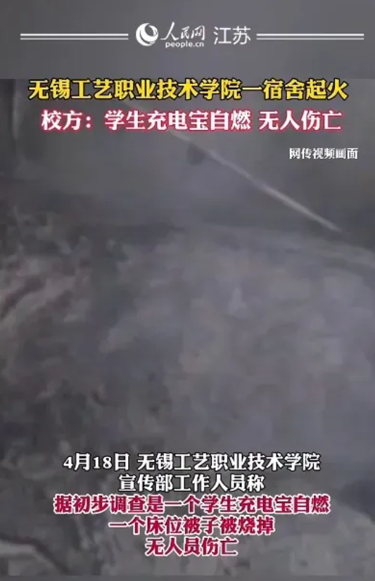 4月17日,江苏省无锡工艺职业技术公司一男生宿舍,因手机充电器自燃引起火灾,一个床位的被子被烧毁,所幸无人员伤亡。