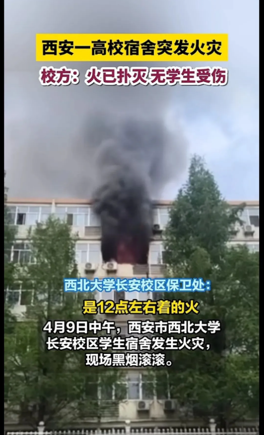 2024年4月9日中午,西安市西北大学女生宿舍发生火灾,着火房间冒出滚滚浓烟,火舌从窗户往外冒出,直至下午,明火才被扑灭。